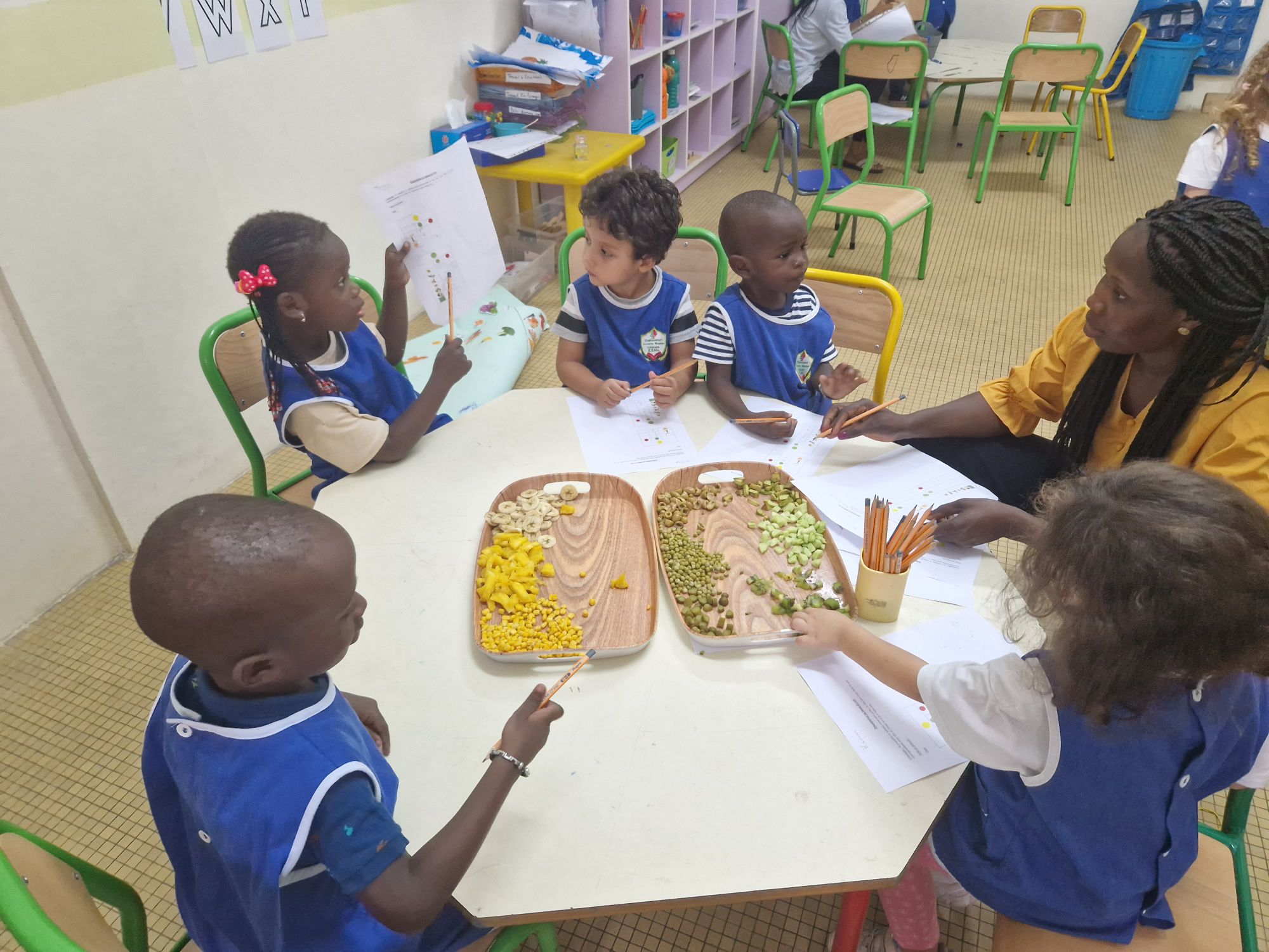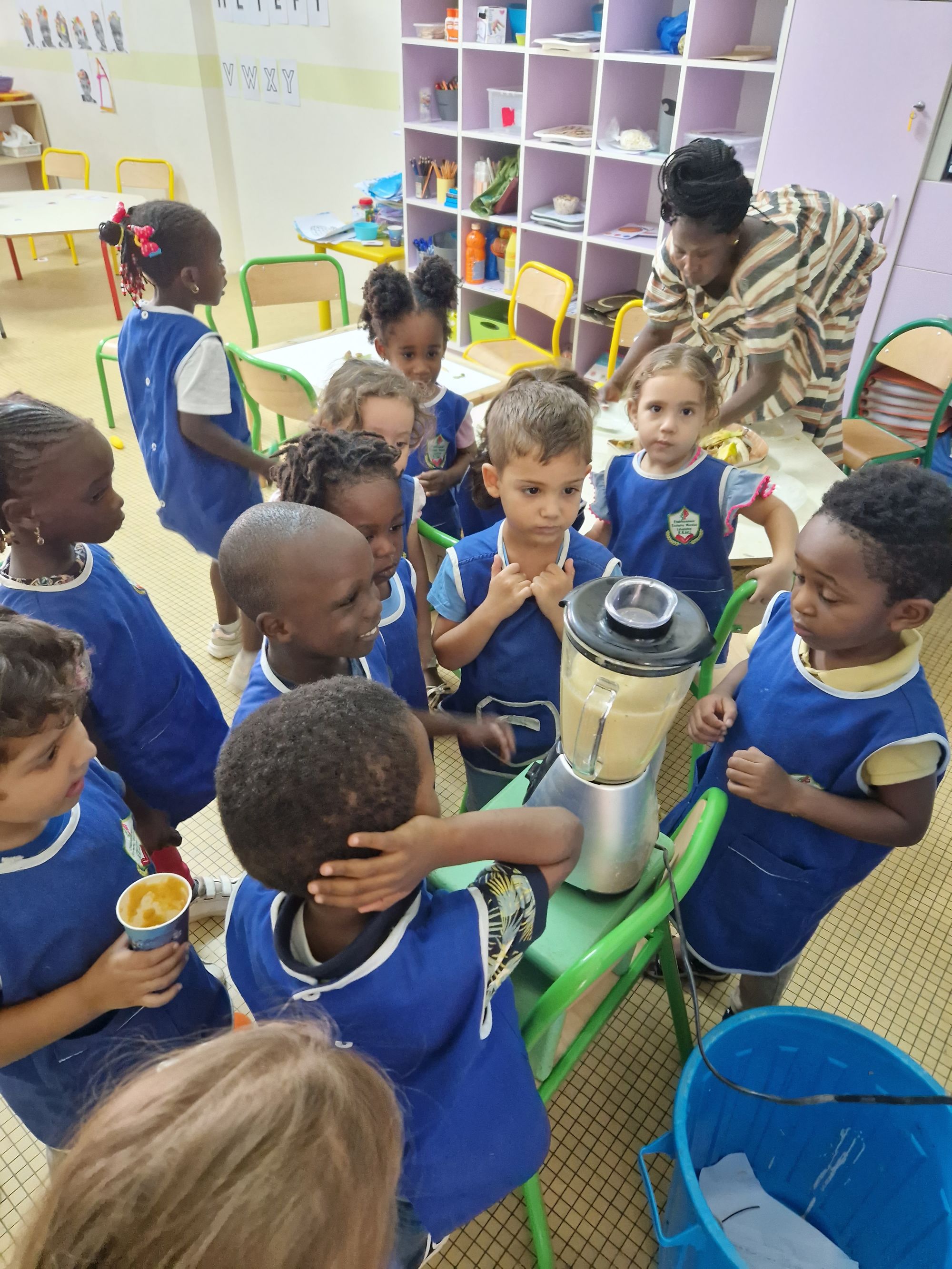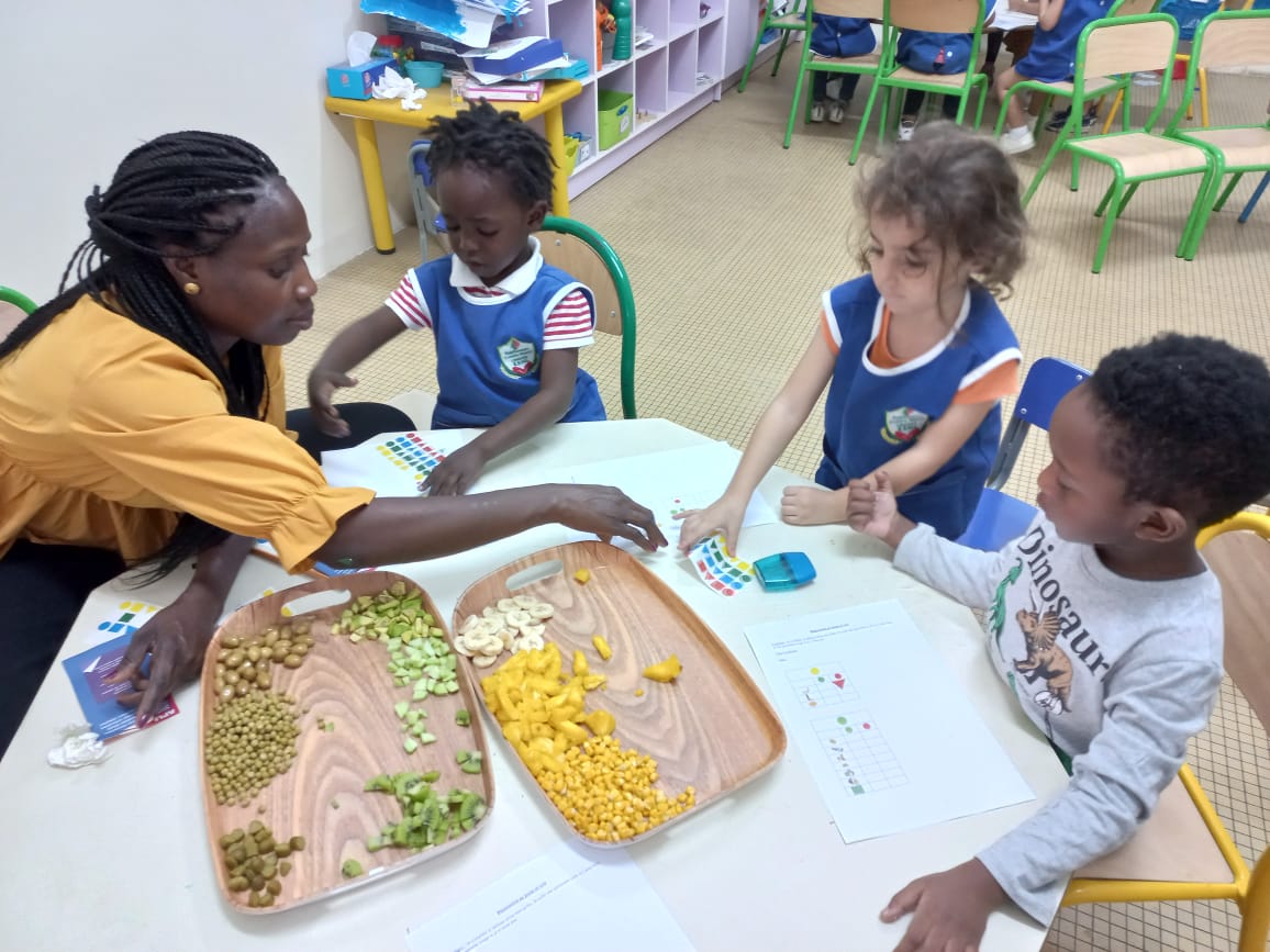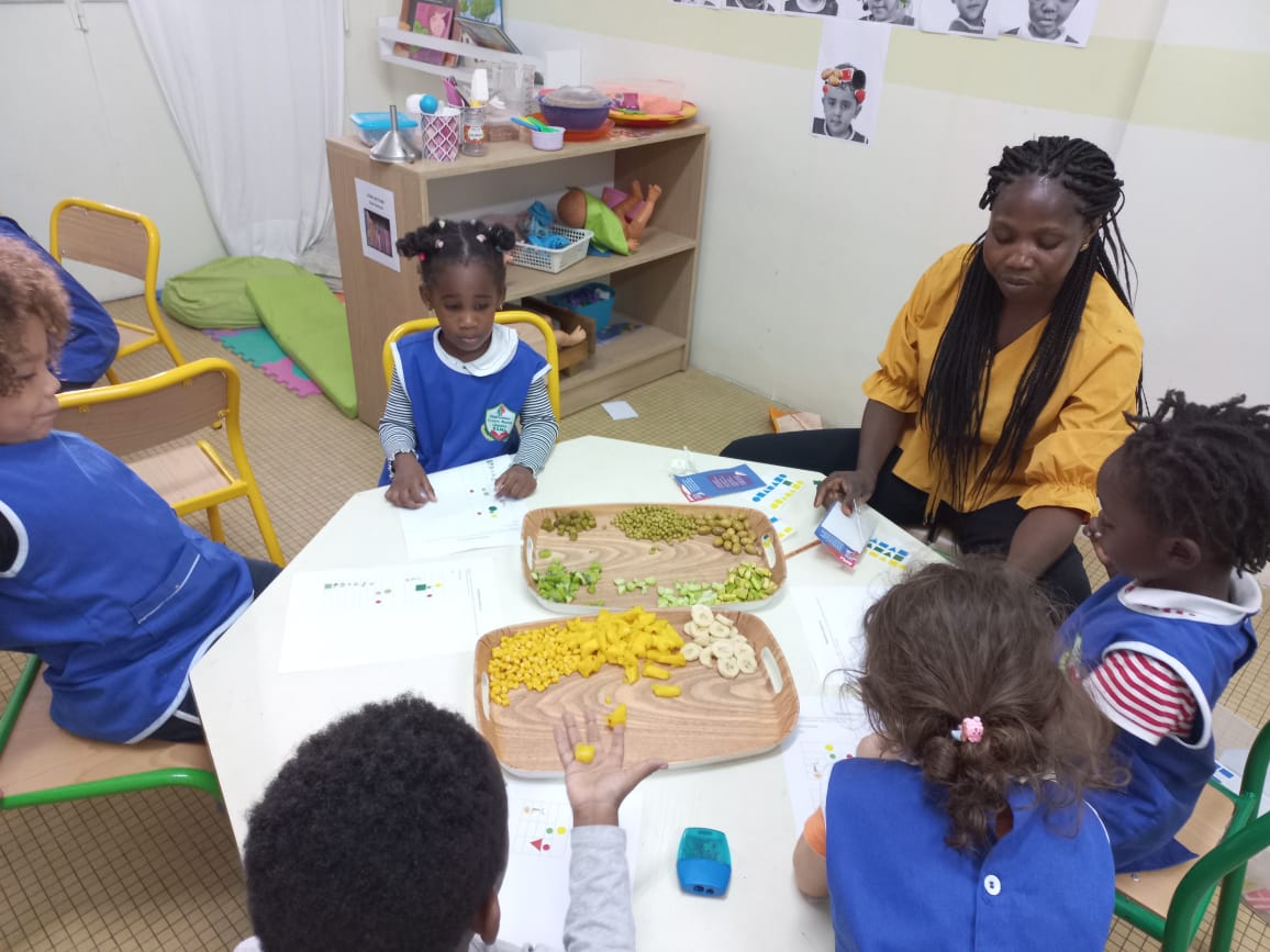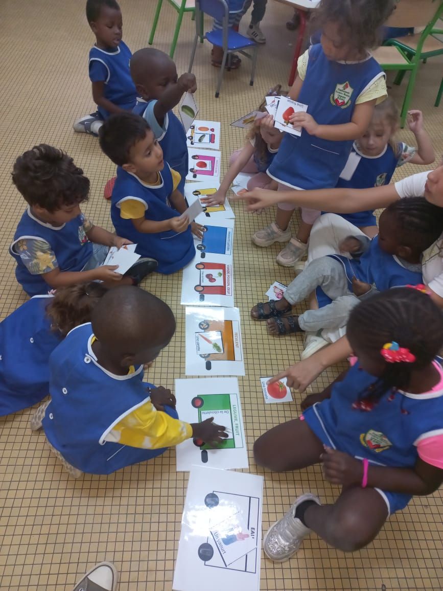 Cette semaine du 13 au 17 novembre, les élèves de maternelle ont travaillé autour d'un thème commun : l'alimentation, et plus particulièrement les fruits et les légumes. Les enfants ont (re)découvert le nom des fruits et légumes qu'ils consomment souvent mais aussi de ceux qu'ils n'ont jamais consommés ! D'ailleurs, ce projet a été l’occasion pour eux de gouter chaque jour de nouveaux aliments ! Si la banane et le kaki ont obtenu beaucoup de succès, les radis et le citron ont suscité plus de grimaces ! Les élèves ont également profité de ce joli thème pour classer les fruits par couleurs, les dessiner, les compter, les éplucher et les découper pour en faire des smoothies et s'inspirer d'artistes qui ont utilisé les fruits et légumes dans l'art.